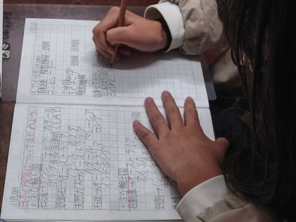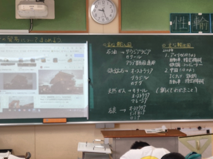 社会科の時間は、教科書の資料を見ながら、日本の輸出にはどんな特色があるのか調べ、わかったことをノートにまとめました。