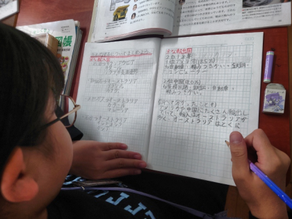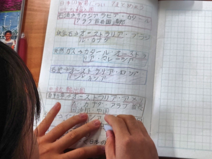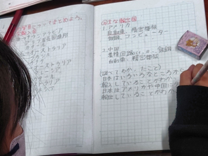 社会科の時間は、教科書の資料を見ながら、日本の輸出にはどんな特色があるのか調べ、わかったことをノートにまとめました。