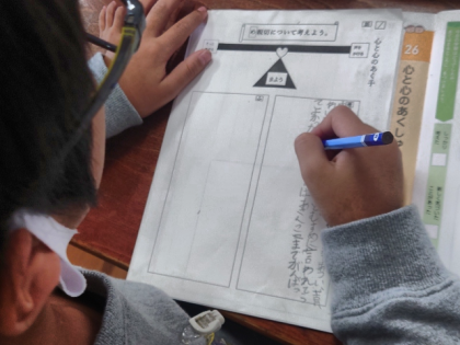 道徳の時間は、教材文「心と心のあく手」を学習しました。