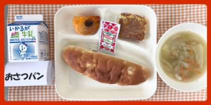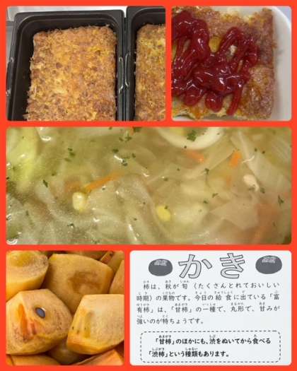 今日の献立は、ツナポテトオムレツ・スープ・かき(富有柿)・おさつパン・牛乳でした。