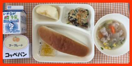 今日の献立は、ほうれんそうのグラタン・スープ煮・りんご・コッペパン・マーマレード・牛乳でした。