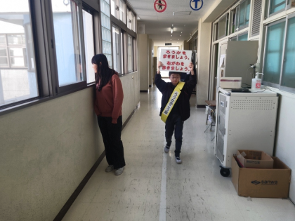校舎内のけがを防ぐために、健康委員会の子どもたちが、ろうかは右側を歩くよう声かけをしています。