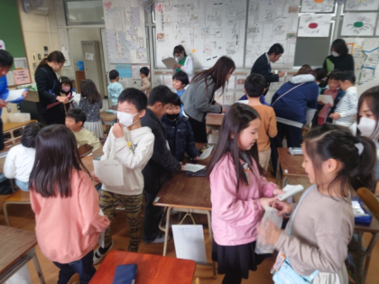 この時間には、子どもたちは学習カードをもとに、家の周りの場所や物、人など、自分の知っている焼野の町のすてきなところを交流しました。