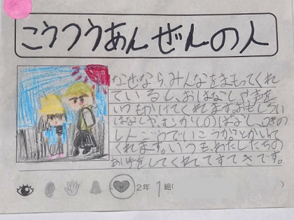 生活科の時間は、自分たちが住んでいる町を探検し、様々な人や場所と関わることを通して、地域のよさに気付き、親しみや愛着をもって進んで人に接したり、自分の生活を広げようとしたりすることをねらいとして学習しています。