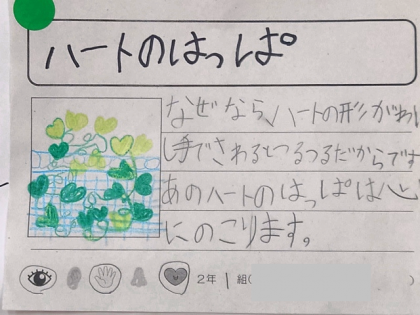 ワークシートには、「そうじしている人がすてきだと思った。」「ハートの葉っぱがすごいと思った。」「岩が黒と白があるのがさわってみたいと思った。」「五番橋にカメがいたなんて知らなかった。」「○○さんが紹介したお店に行ったことがないから行ってみたい。」などの感想を書いていました。