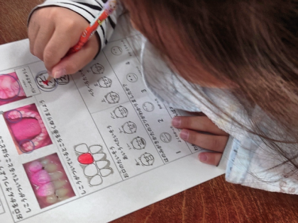 みがき残しを調べる「染め出し」を行ったあと、歯科衛生士さんから歯のみがき方をしっかり教えていただきました。