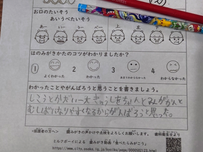 みがき残しを調べる「染め出し」を行ったあと、歯科衛生士さんから歯のみがき方をしっかり教えていただきました。