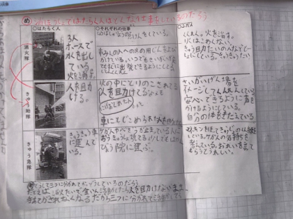社会科の時間は、消防署で働く人たちの仕事について調べ、どうして「消火隊」「救助隊」「救急隊」の3つに分かれて活動しているのか、みんなで考えました。