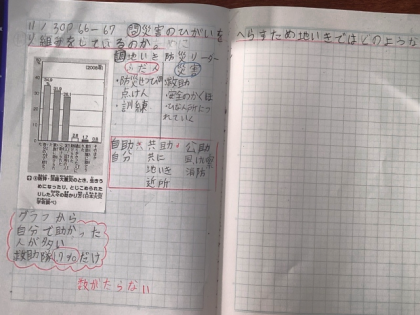 社会科の時間は、自然災害から人びとの命を守るために、地域ではどのような取組みをしているのか、副読本や動画で調べました。
