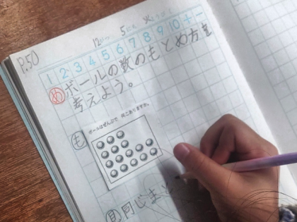 算数科の時間は、L字型に並んだボールの数を、かけ算を使って、いろいろな考え方で求めました。