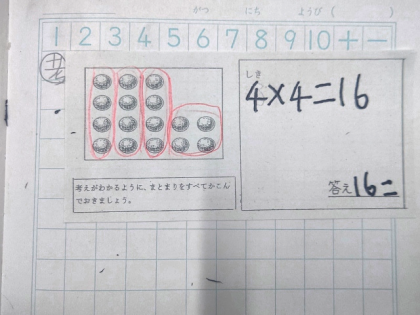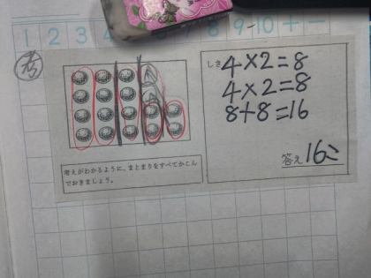 子どもたちは、工夫して同じ数のまとまりをつくると、かけ算を使ってもとめることができることがわかりました。