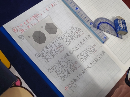 算数科では、正八角形と正六角形の辺の長さや角の大きさを調べ、それぞれの特徴について考えました。
