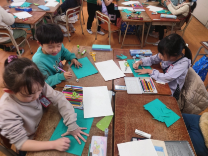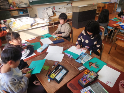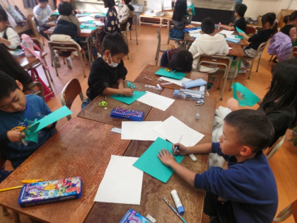 緑の画用紙に手形をとって、はさみで切り取ります。