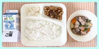 今日の献立は、鶏肉と野菜の煮もの・じゃこ豆・かぶのゆず風味・ごはん・牛乳でした。