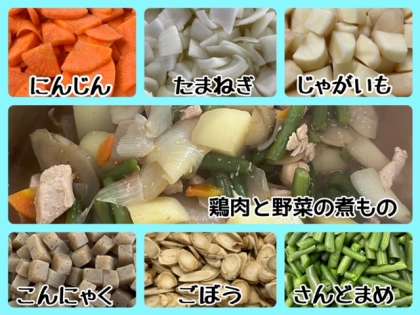 「鶏肉と野菜の煮もの」は、じゃがいも・こんにゃく等を使用して、ボリュームを出しています。
