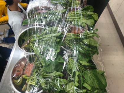 ほうれん草を洗って、ゆでて、切って、お皿に盛りつけ、試食します。
