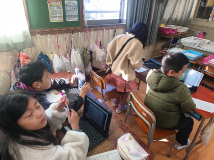 生活科の時間は、昨日のまちたんけんで見つけた焼野のまちの「ステキ」をカードにまとめて、1枚の地図にはっていきました。