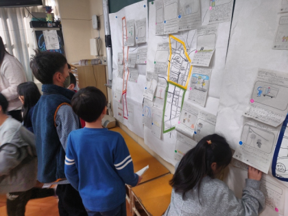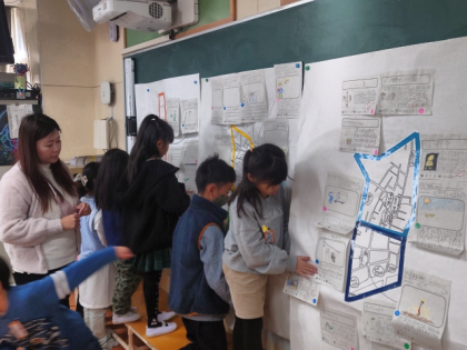 生活科の時間は、昨日のまちたんけんで見つけた焼野のまちの「ステキ」をカードにまとめて、1枚の地図にはっていきました。