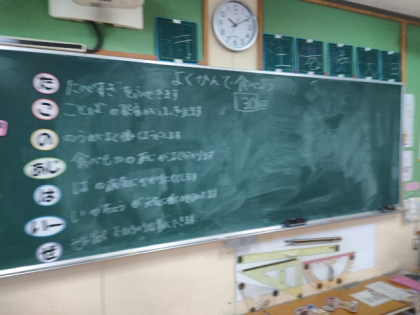 学習の中で、子どもたちは給食のときによくかんで食べるためには、どうすればよいのか一人一人考えました。
