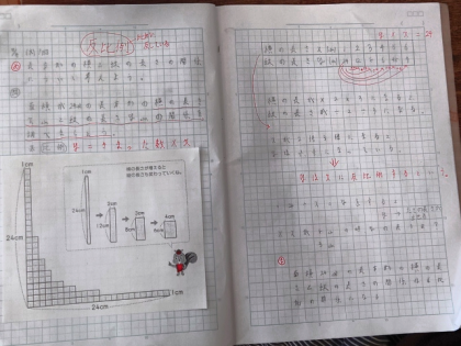 算数科の時間は、面積24平方センチメートルの長方形の横と縦の長さの関係について、表にまとめて調べました。