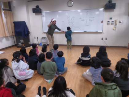 見ている子どもたちは、"Left Left!""Up Up!"と英語で鼻の場所を教えます。