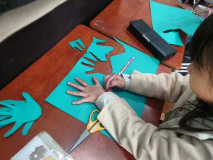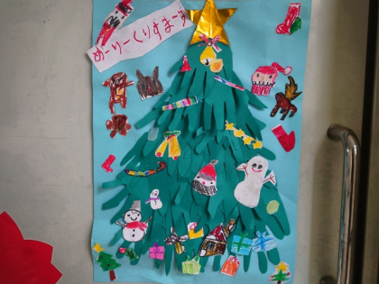以前に、子どもたちが緑の画用紙に手形をとって、はさみで切り取り・・・。