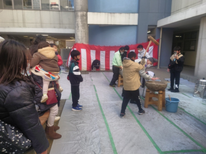 今年も焼野地域諸団体の合同による「もちつき大会」が本校の中庭と講堂で行われています。