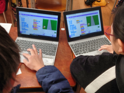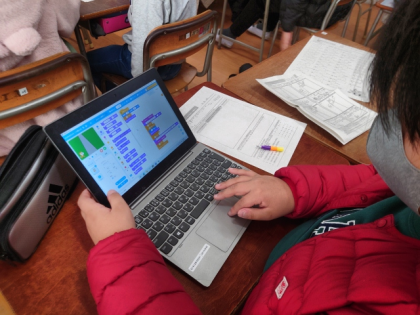 プログラミングアプリ「Scratch」を使って、4こまマンガをもとにアニメーションを作っています。