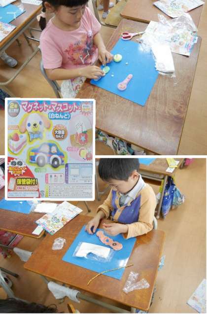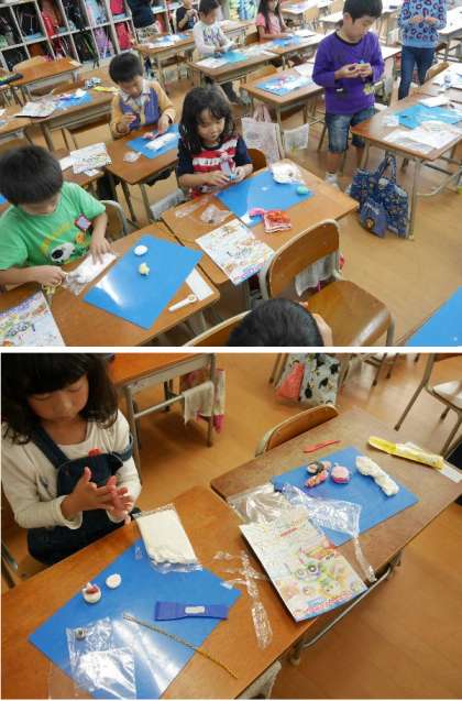 1年生が紙ねんどに色をつけてマスコットを作っています。最後にマグネットをつけて完成させます。何ができるのかな?お寿司のねたを作っている人もいますね。