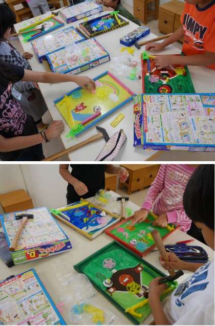 4年生の図工でコリントゲームを仕上げています。かなづちのたたく音が図工室から響いています。楽しいゲームができるといいですね。