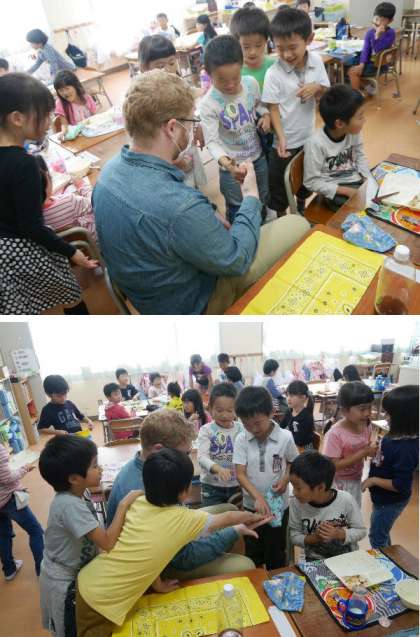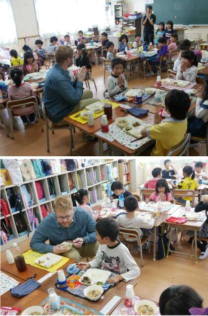 1年生の給食に、茨田北中学校から英語ネイティブのメイソン先生が来てくれました。今日は1年生の教室で給食です。なかなか英語が話せないで尻込みする子も多いけど、興味は深々です。英語でじゃんけんをしたり、指ずもうをしたりとだんだん寄ってきて楽しそうです。