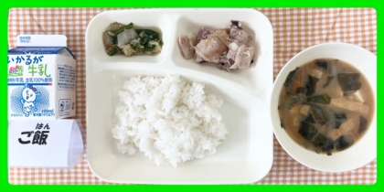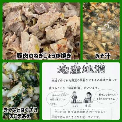 今日の献立は、豚肉のねぎじょうゆ焼き・みそ汁・きくなとはくさいのごまあえ・ごはん・牛乳でした。
