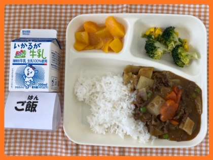 献立は、冬野菜のカレーライス・ブロッコリーとコーンのサラダ・黄桃(カット缶)・牛乳でした。
