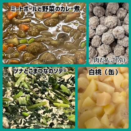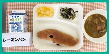 今日の献立は、ミートボールと野菜のカレー煮・ツナとこまつなのソテー・白桃(カット缶)・レーズンパン・牛乳です。