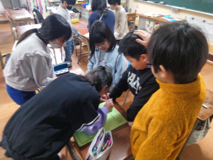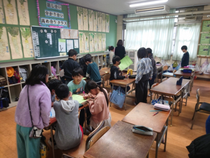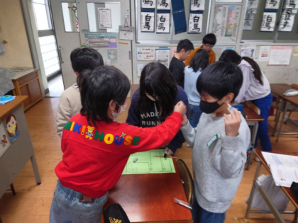 学習係、運営係、体育係、お楽しみ係など、3学期の新しい係のメンバーに分かれて、仕事を紹介する掲示物を書いています。