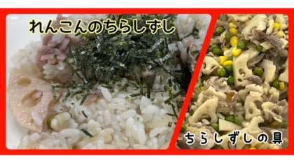 れんこんのちらしずしは、豚肉・れんこん・グリンピース・コーン・かんぴょうを使用し、粉末こんぶを加えて旨みを増した混ぜご飯です。喫食時にきざみのりをかけて食べます。
