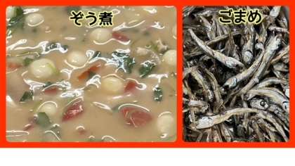 今日の献立は、れんこんのちらしずし・ぞう煮・ごまめ・牛乳でした。お正月の行事献立です。