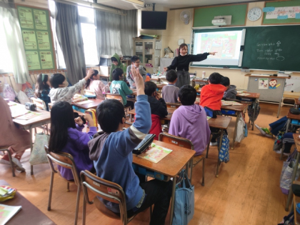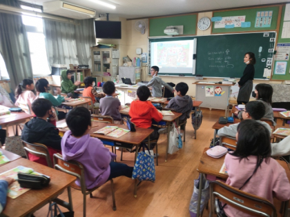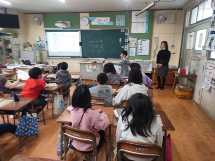 英語活動の時間は、"turn left""turn righit""go straight"などの英語の表現を使いながら、「お宝」を持っている人を当てるゲームをして、楽しみながら学習しました。