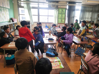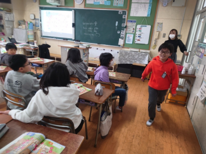 英語活動の時間は、"turn left""turn righit""go straight"などの英語の表現を使いながら、「お宝」を持っている人を当てるゲームをして、楽しみながら学習しました。