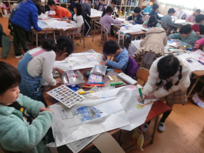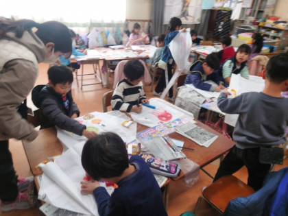 ビニールカイトに絵を描いて、たこあげのたこをつくっています。