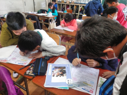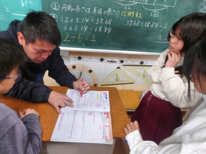 授業の終わりに、みんなで教え合いながら練習問題を解いています。