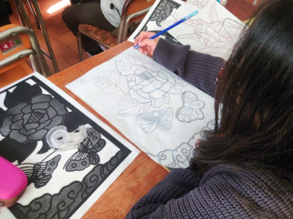 今日は、彫刻刀で彫っていくために、下絵を版画板にうつしとっています。