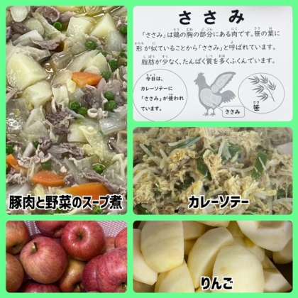 今日の献立は、豚肉と野菜のスープ煮・カレーソテー・りんご・パン・牛乳でした。