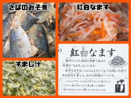 今日の献立は、さばのみそ煮・すまし汁・紅白なます・ごはん・牛乳でした。