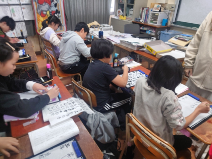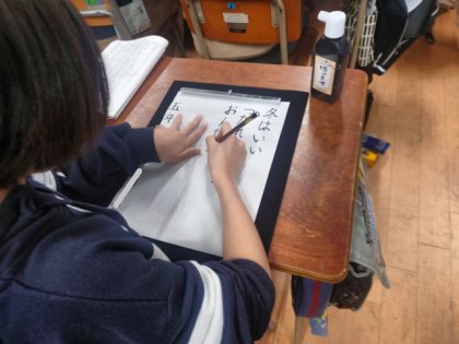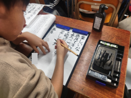 国語科の時間は、心に残った言葉を三十一音で表し、毛筆の小筆で半紙に書きました。