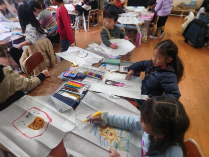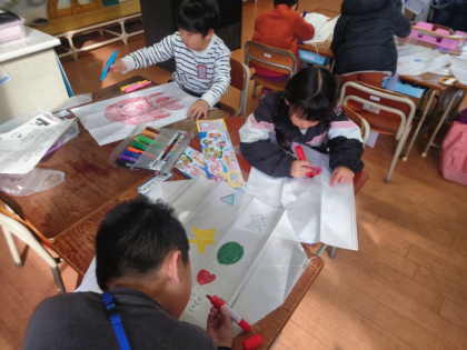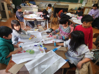 ビニールカイトに絵を描いて、たこあげのたこをつくっています。