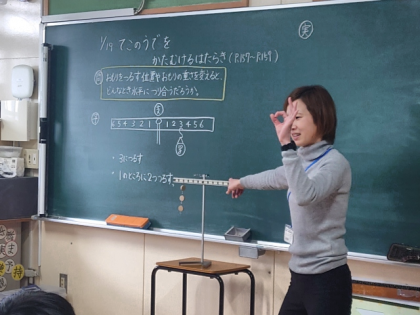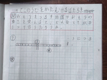 理科の時間は、てこの左右のうでで、おもりをつるす位置やおもりの重さを変えると、どんなときに水平につり合うのか、実験で調べます。