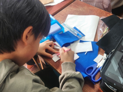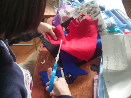 まだ作業を始めたばかりですが、形を考えてたちばさみで切ったり、なみ縫い、返し縫い、かがり縫いなどいろいろな縫い方でフェルトを縫い合わせたり、これまで学んだことを生かして活動していきます。