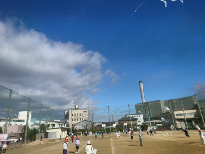 生活科の時間は、自分たちが作ったビニールカイトを運動場で飛ばしました。