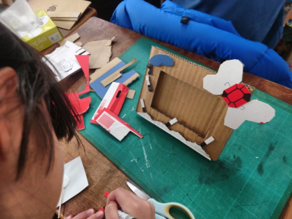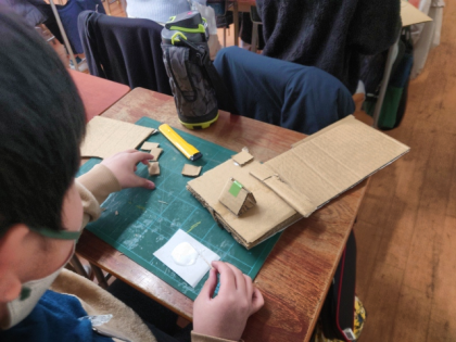 図画工作科の時間は、段ボールを材料にして、自分だけのフォトフレームを作っています。段ボールの素材をどのように工夫して使うかがポイントです。